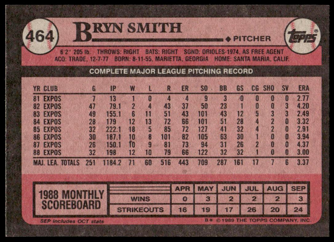 This Baseball card, from 1989 is part of the Topps  card set. Bryn Smith is featured and has a card number of 464.