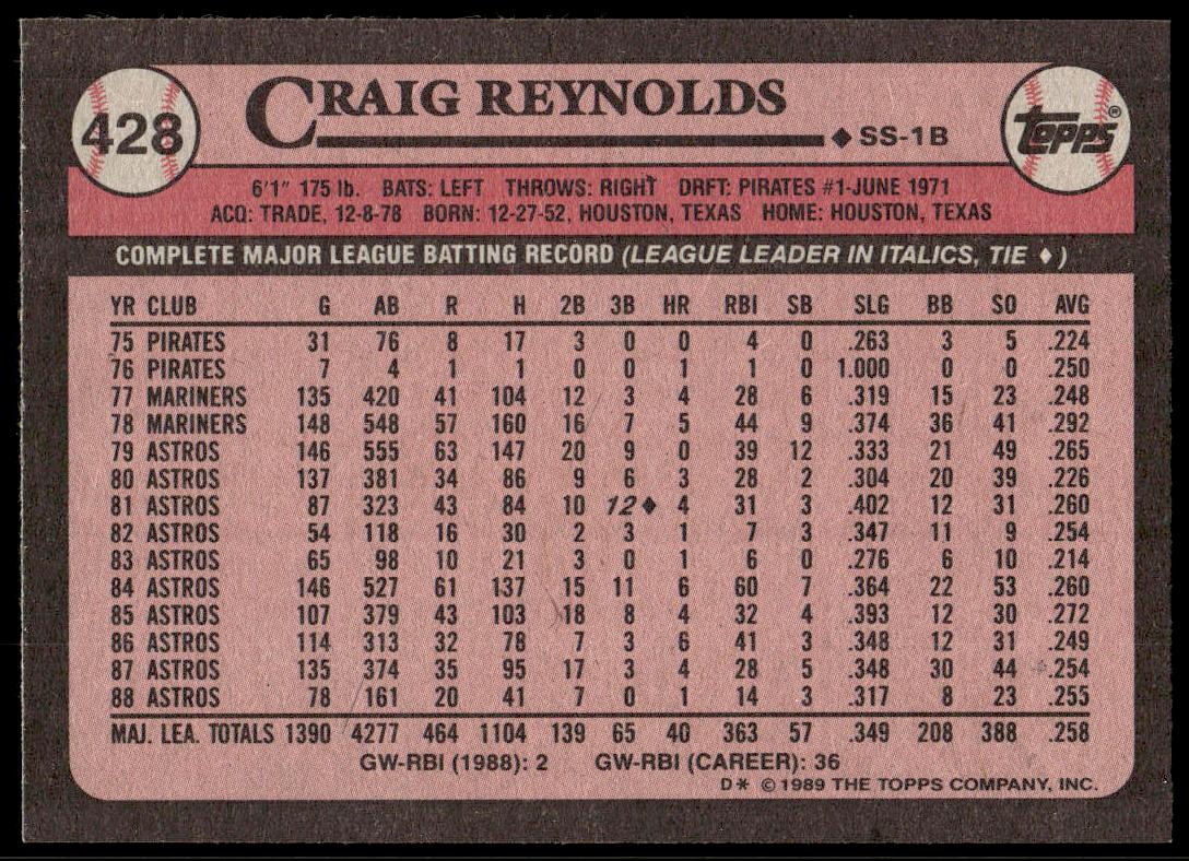 This Baseball card, from 1989 is part of the Topps  card set. Craig Reynolds is featured and has a card number of 428.