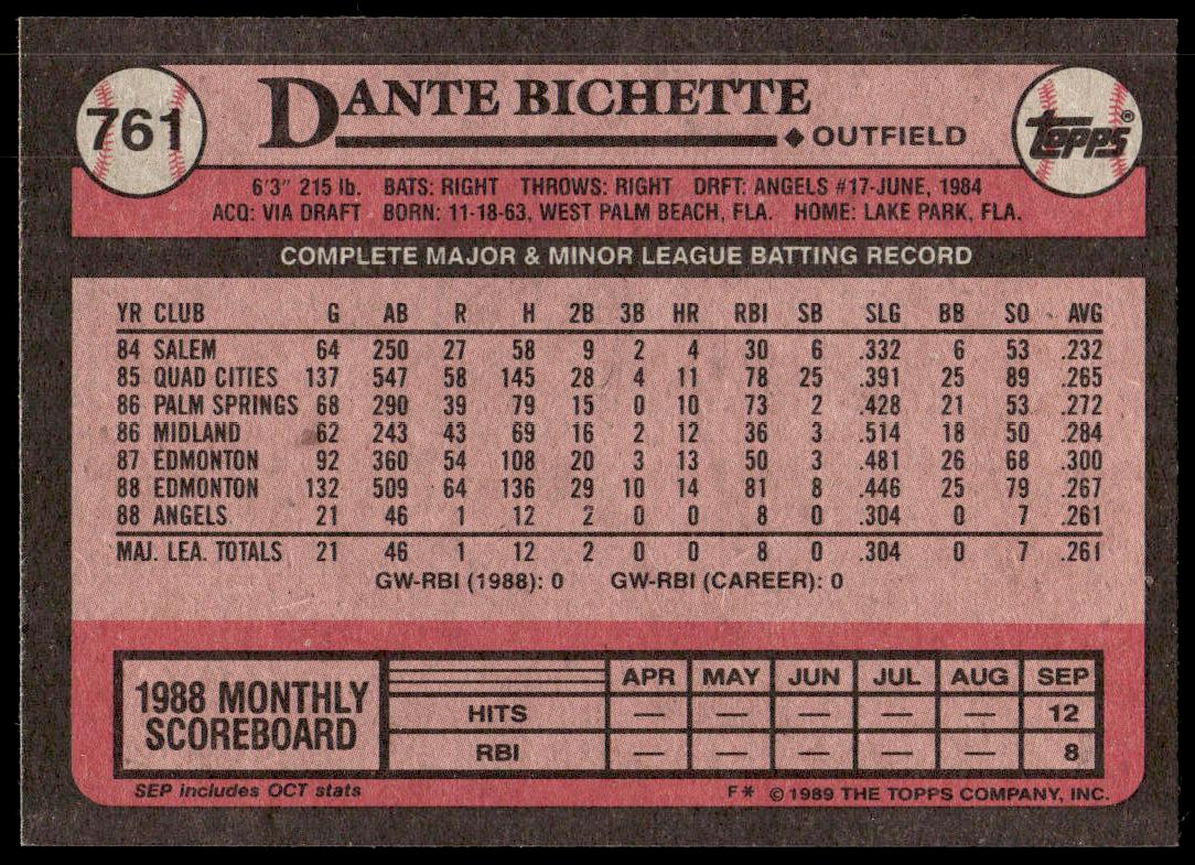 This Baseball card, from 1989 is part of the Topps  card set. Dante Bichette is featured and has a card number of 761.