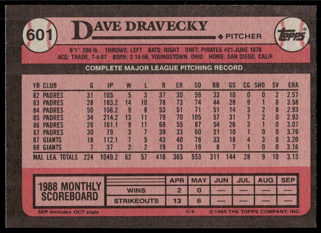 This Baseball card, from 1989 is part of the Topps  card set. Dave Dravecky is featured and has a card number of 601.