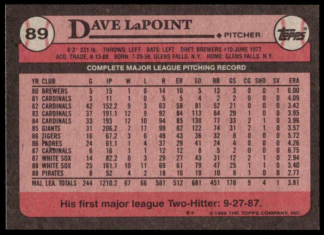 This Baseball card, from 1989 is part of the Topps  card set. Dave LaPoint is featured and has a card number of 89.