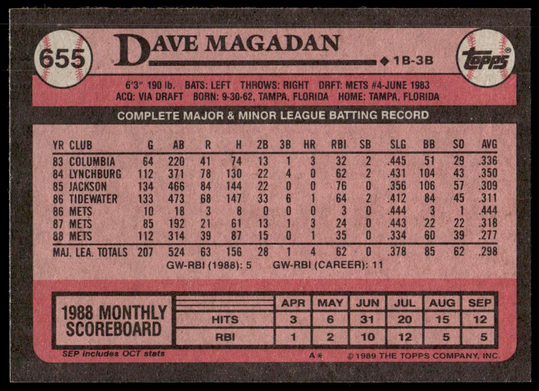 This Baseball card, from 1989 is part of the Topps  card set. Dave Magadan is featured and has a card number of 655.