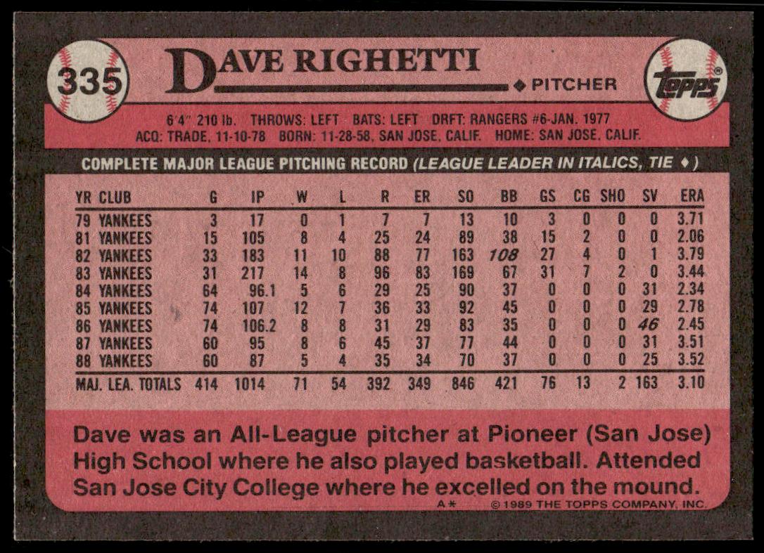 This Baseball card, from 1989 is part of the Topps  card set. Dave Righetti is featured and has a card number of 335.