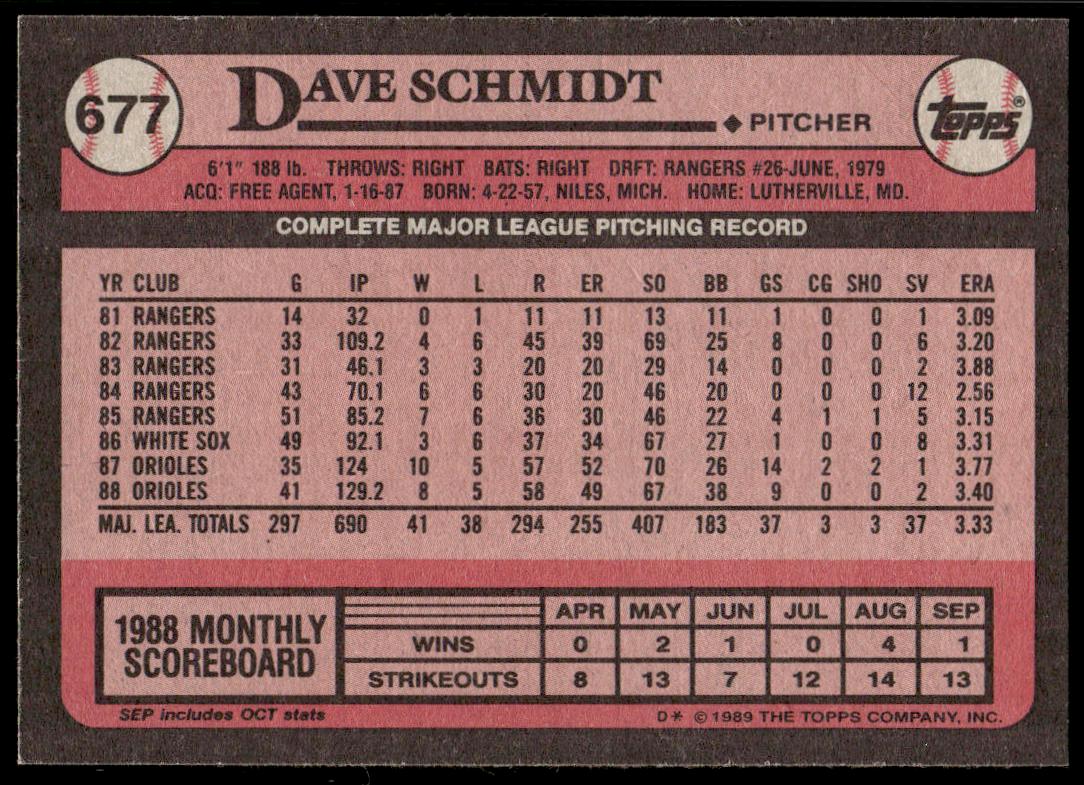 This Baseball card, from 1989 is part of the Topps  card set. Dave Schmidt is featured and has a card number of 677.