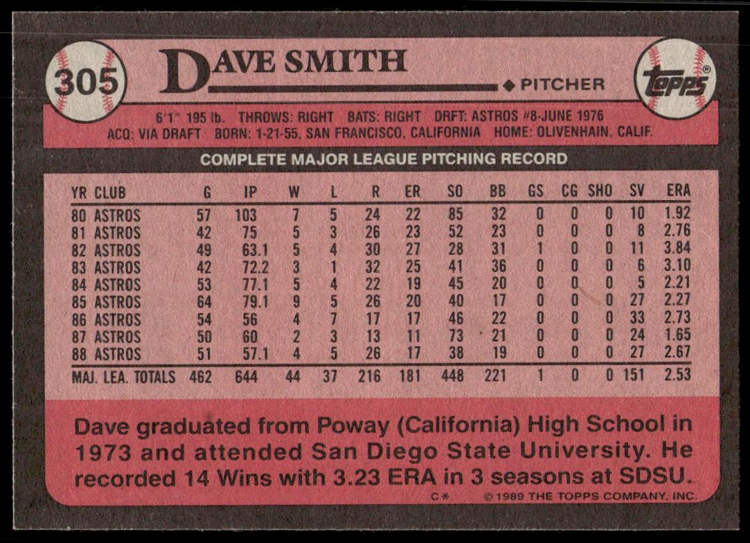 This Baseball card, from 1989 is part of the Topps  card set. Dave Smith is featured and has a card number of 305.