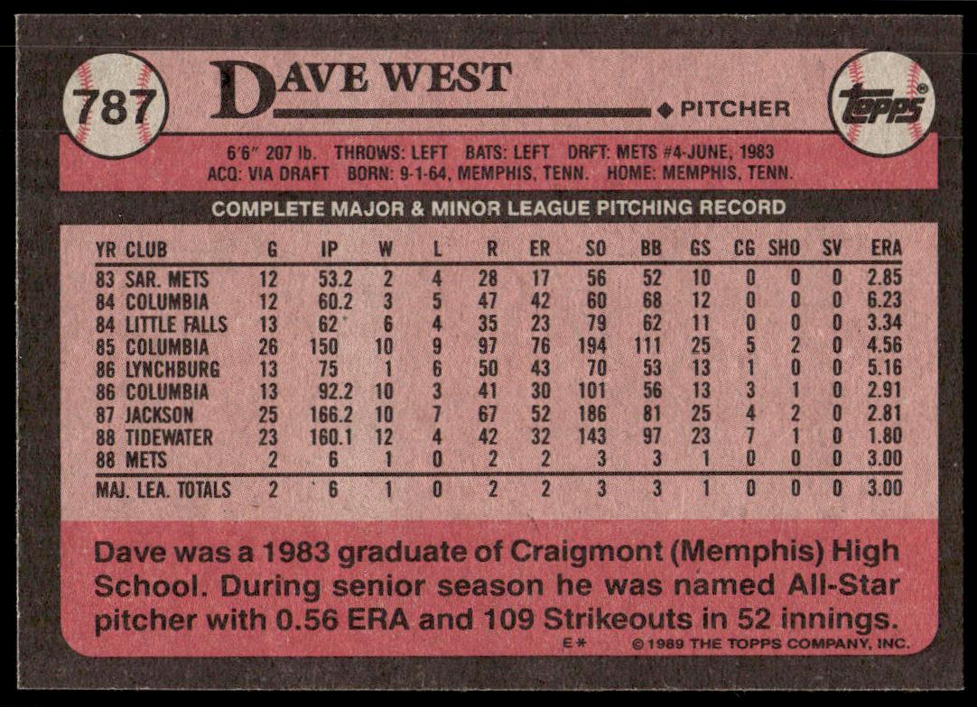 This Baseball card, from 1989 is part of the Topps  card set. Dave West is featured and has a card number of 787.