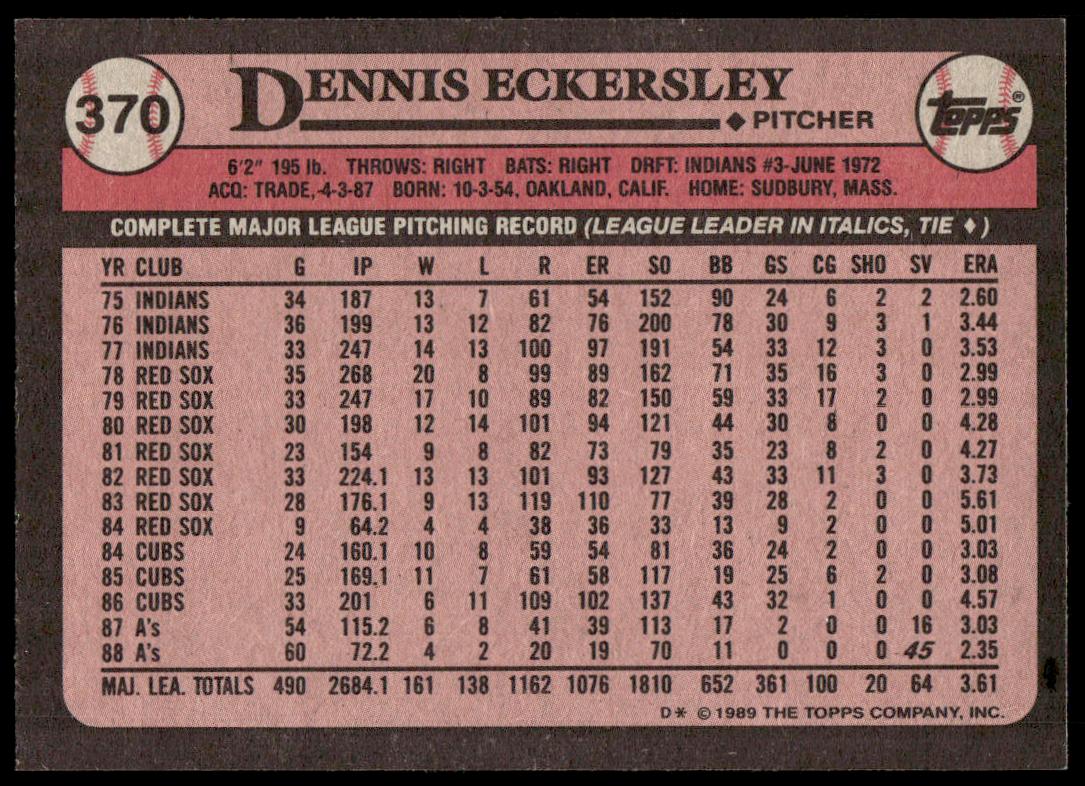 This Baseball card, from 1989 is part of the Topps  card set. Dennis Eckersley is featured and has a card number of 370.