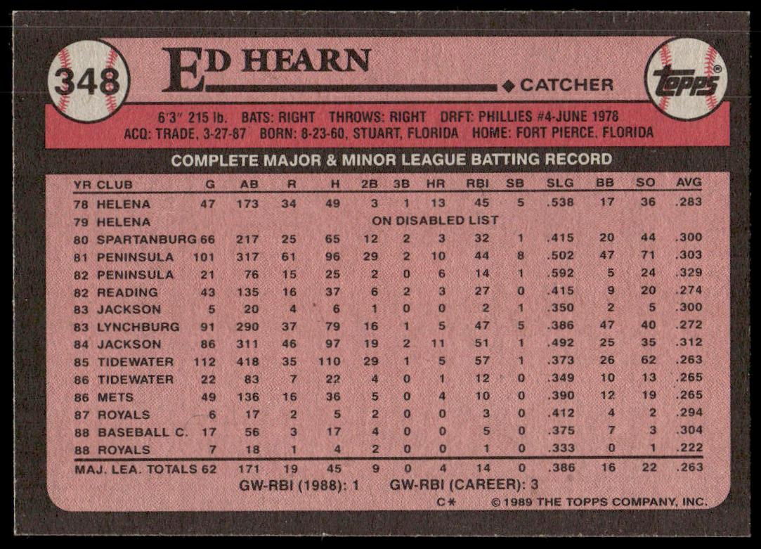 This Baseball card, from 1989 is part of the Topps  card set. Ed Hearn is featured and has a card number of 348.