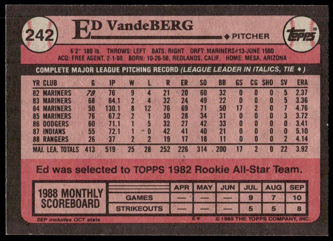 This Baseball card, from 1989 is part of the Topps  card set. Ed Vande Berg is featured and has a card number of 242.