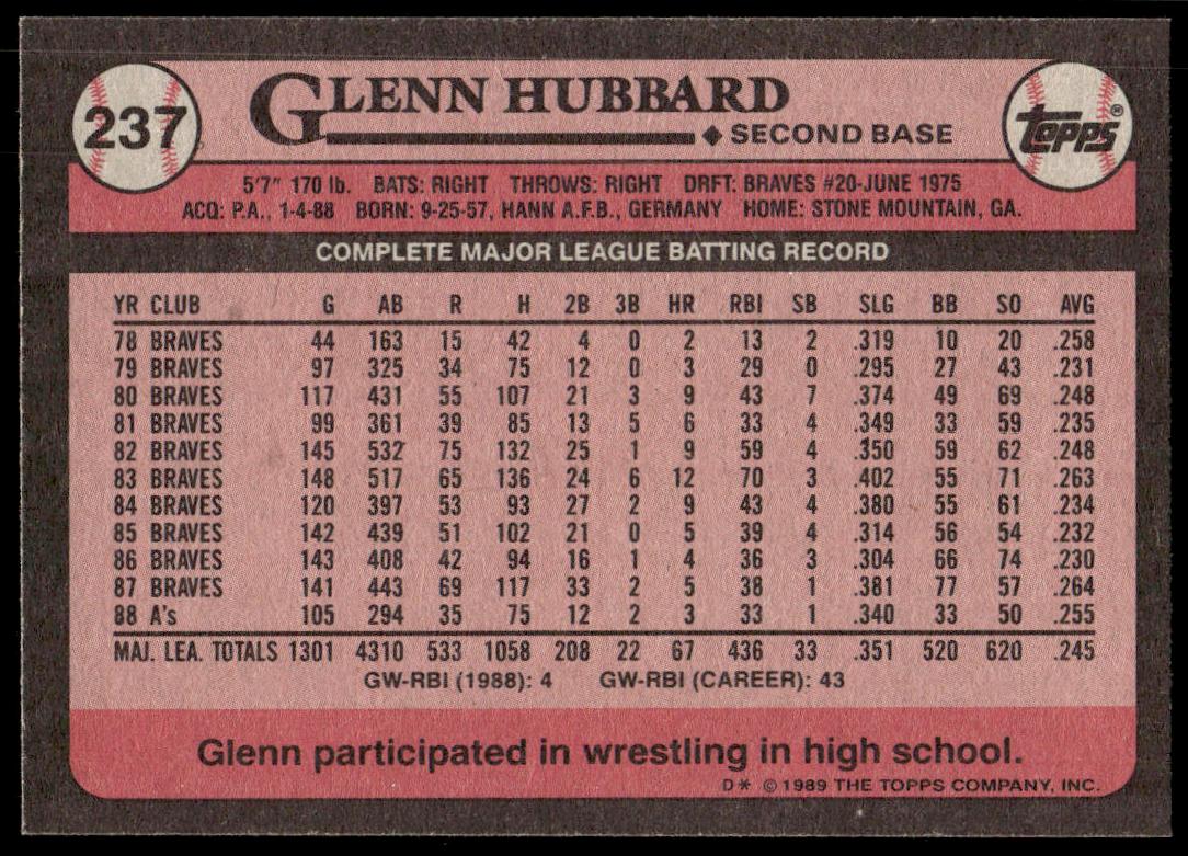 This Baseball card, from 1989 is part of the Topps  card set. Glenn Hubbard is featured and has a card number of 237.