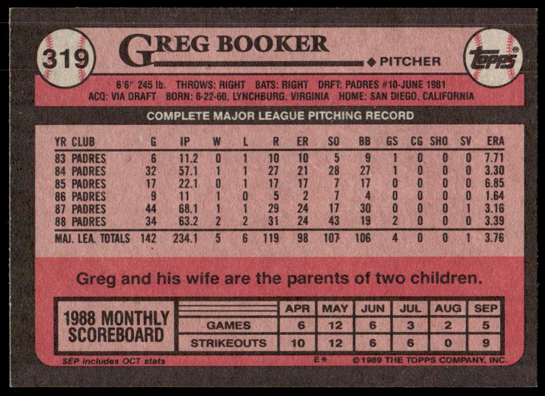 This Baseball card, from 1989 is part of the Topps  card set. Greg Booker is featured and has a card number of 319.