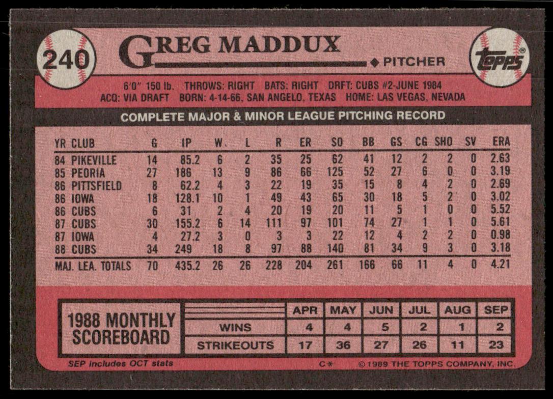 This Baseball card, from 1989 is part of the Topps  card set. Greg Maddux is featured and has a card number of 240.