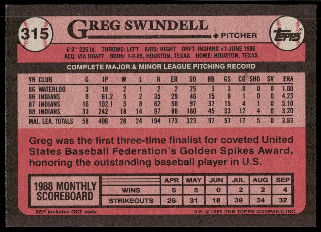 This Baseball card, from 1989 is part of the Topps  card set. Greg Swindell is featured and has a card number of 315.