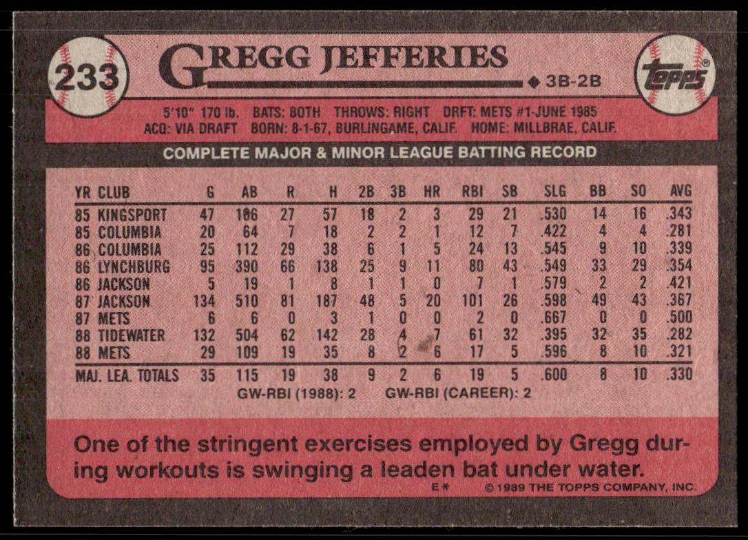 This Baseball card, from 1989 is part of the Topps  card set. Gregg Jefferies is featured and has a card number of 233.