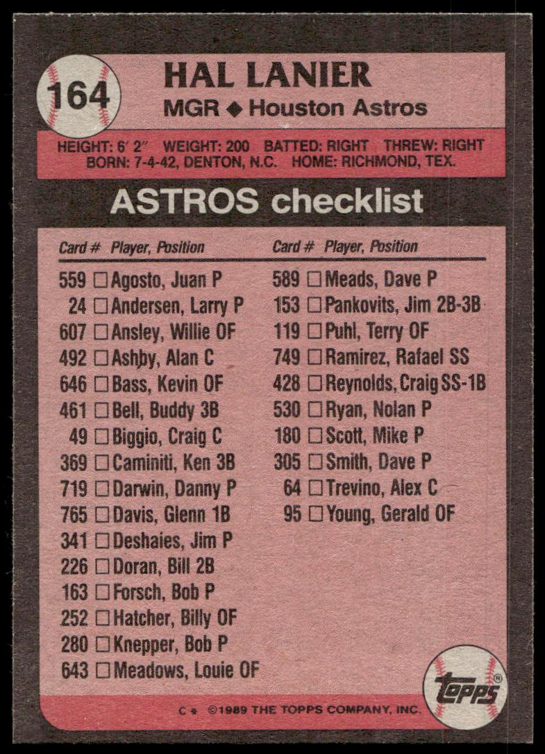 This Baseball card, from 1989 is part of the Topps  card set. Hal Lanier is featured and has a card number of 164.