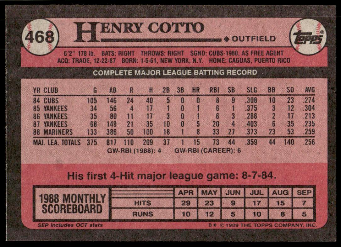 This Baseball card, from 1989 is part of the Topps  card set. Henry Cotto is featured and has a card number of 468.