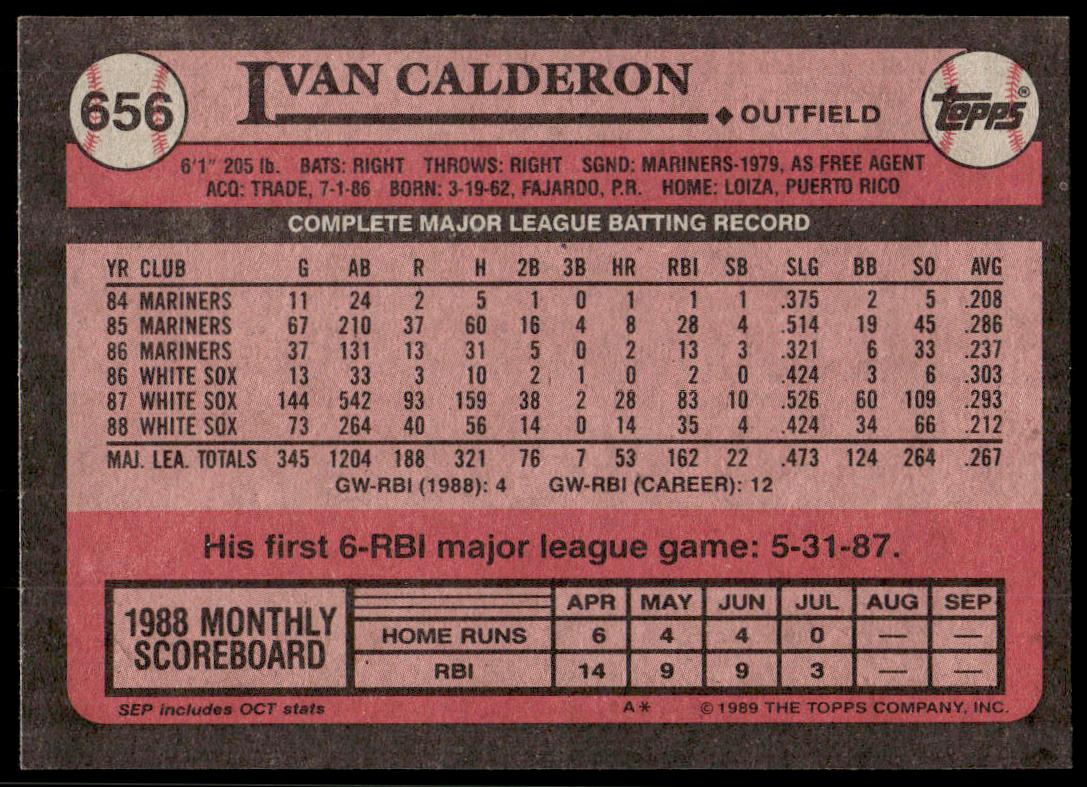 This Baseball card, from 1989 is part of the Topps  card set. Ivan Calderon is featured and has a card number of 656.