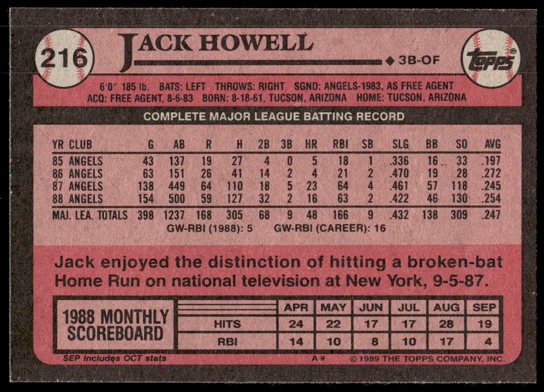 This Baseball card, from 1989 is part of the Topps  card set. Jack Howell is featured and has a card number of 216.