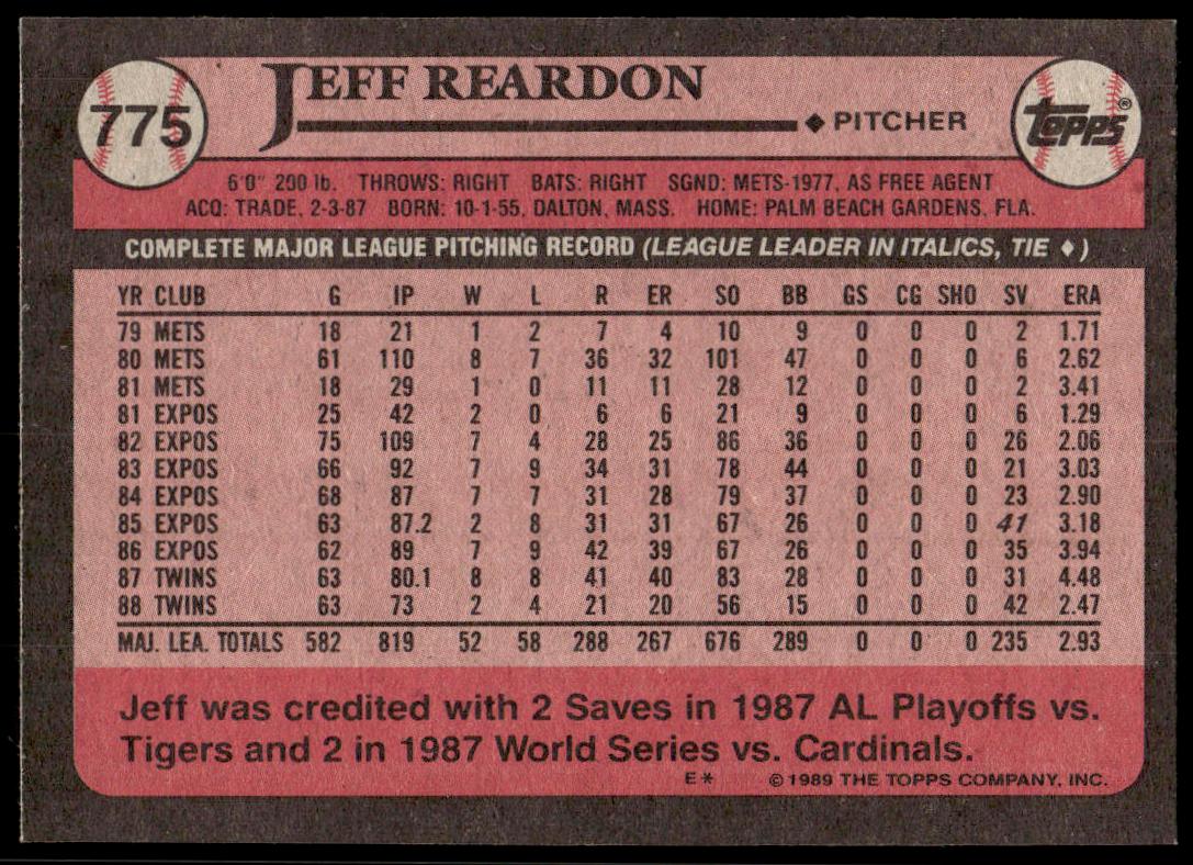 This Baseball card, from 1989 is part of the Topps  card set. Jeff Reardon is featured and has a card number of 775.