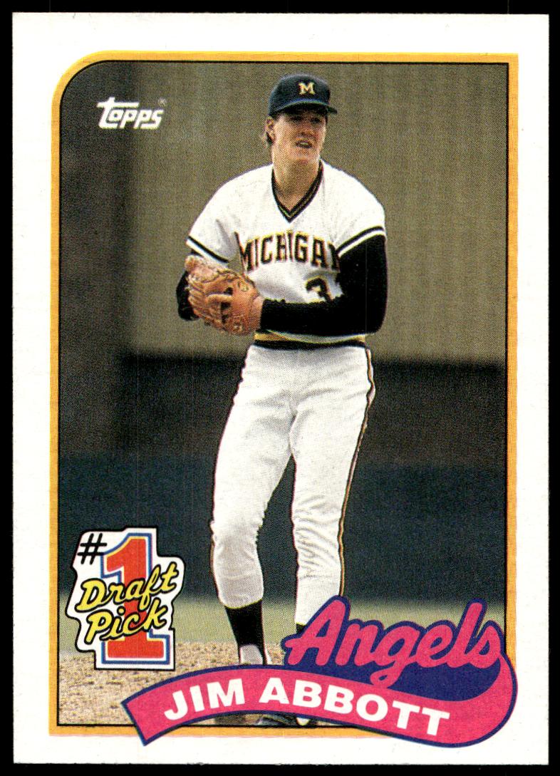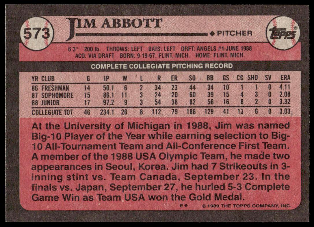 This Baseball card, from 1989 is part of the Topps  card set. Jim Abbott is featured and has a card number of 573.
