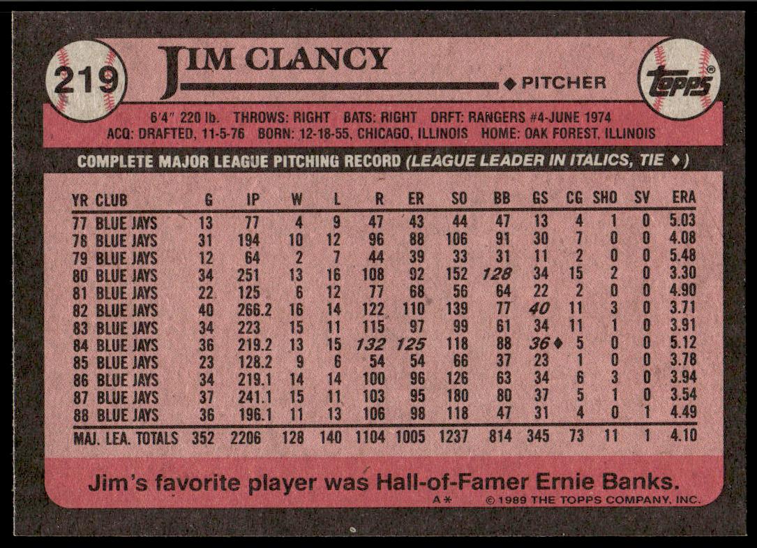 This Baseball card, from 1989 is part of the Topps  card set. Jim Clancy is featured and has a card number of 219.