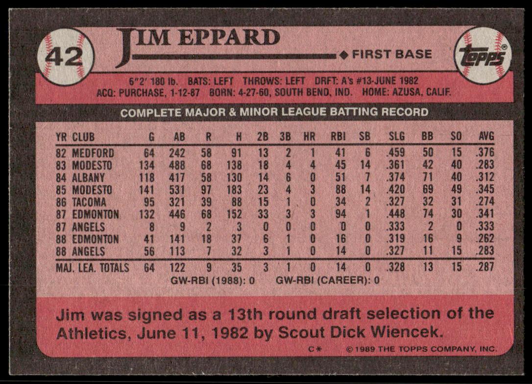 This Baseball card, from 1989 is part of the Topps  card set. Jim Eppard is featured and has a card number of 42.