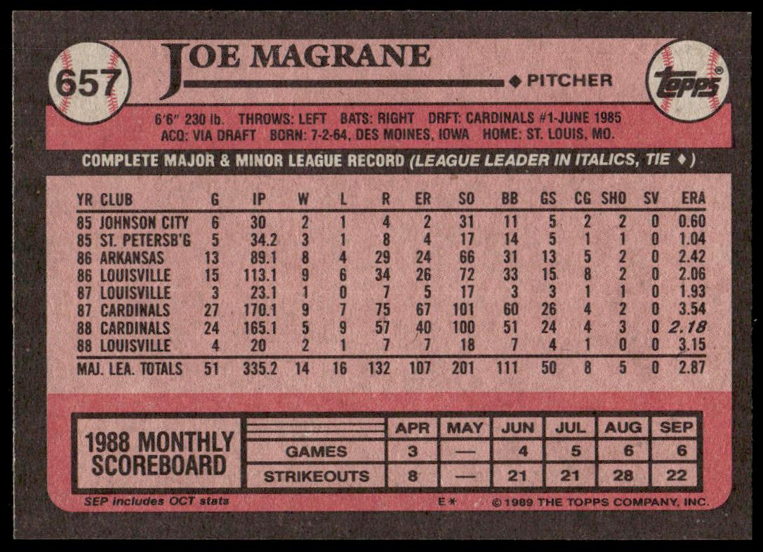 This Baseball card, from 1989 is part of the Topps  card set. Joe Magrane is featured and has a card number of 657.