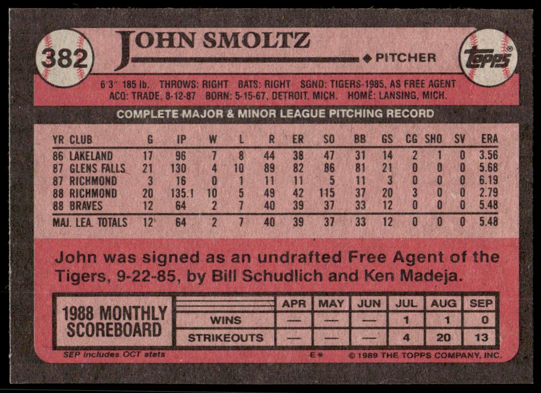 This Baseball card, from 1989 is part of the Topps  card set. John Smoltz is featured and has a card number of 382.