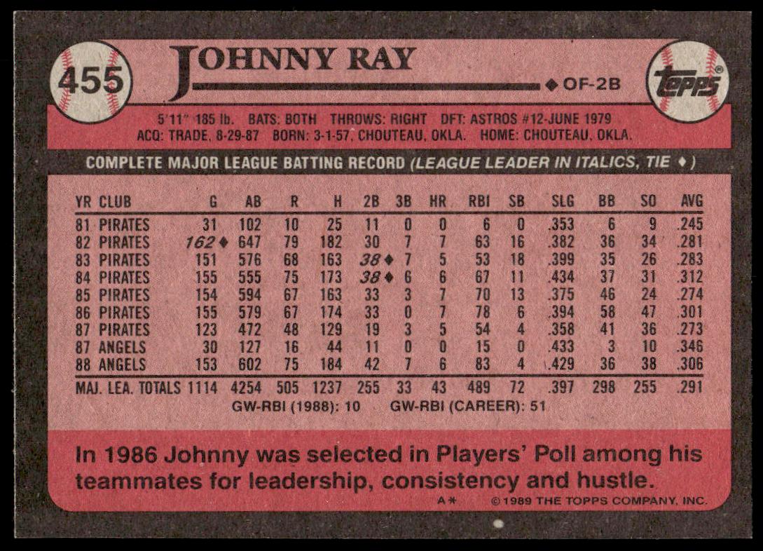 This Baseball card, from 1989 is part of the Topps  card set. Johnny Ray is featured and has a card number of 455.