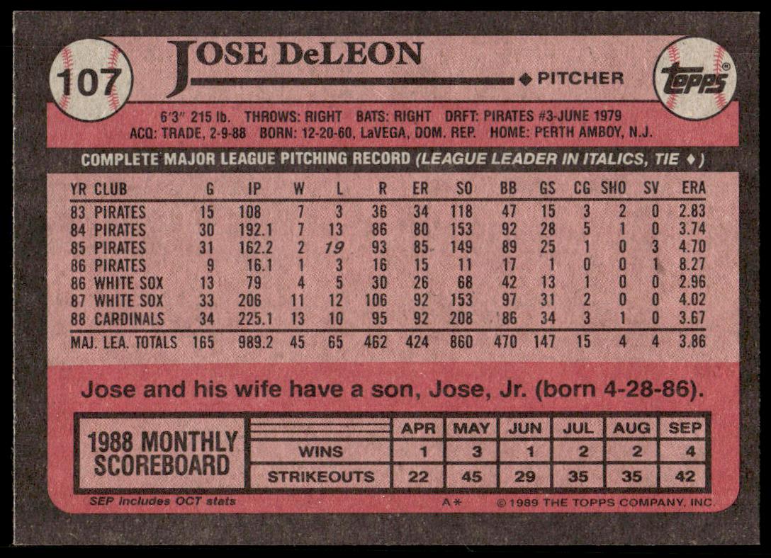 This Baseball card, from 1989 is part of the Topps  card set. Jose DeLeon is featured and has a card number of 107.