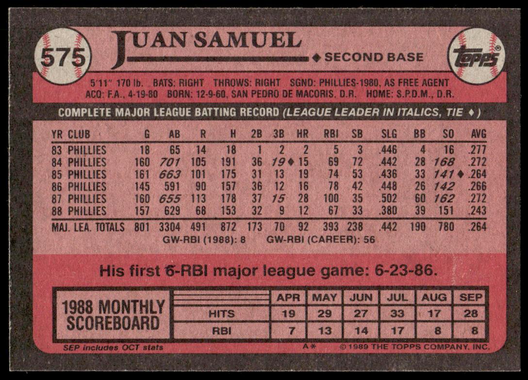 This Baseball card, from 1989 is part of the Topps  card set. Juan Samuel is featured and has a card number of 575.