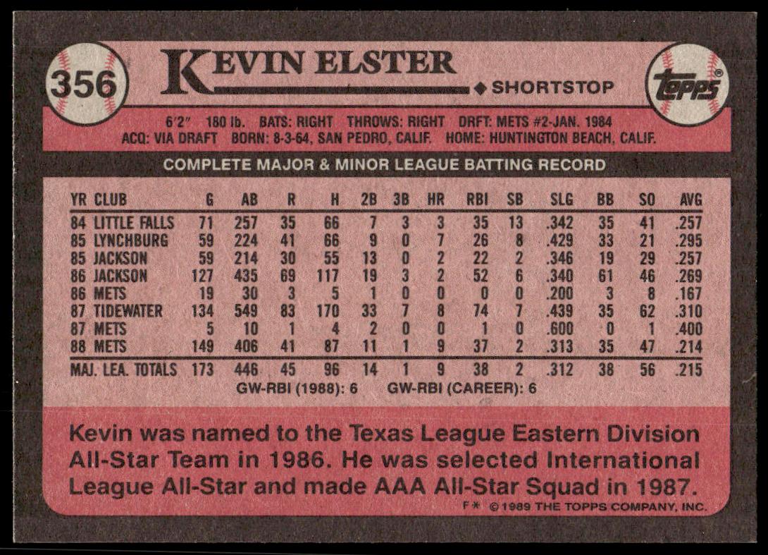 This Baseball card, from 1989 is part of the Topps  card set. Kevin Elster is featured and has a card number of 356.