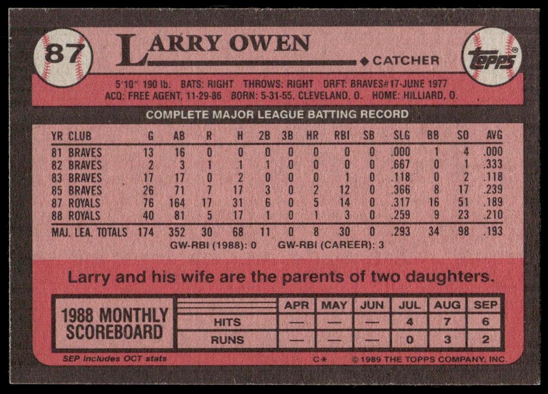 This Baseball card, from 1989 is part of the Topps  card set. Larry Owen is featured and has a card number of 87.