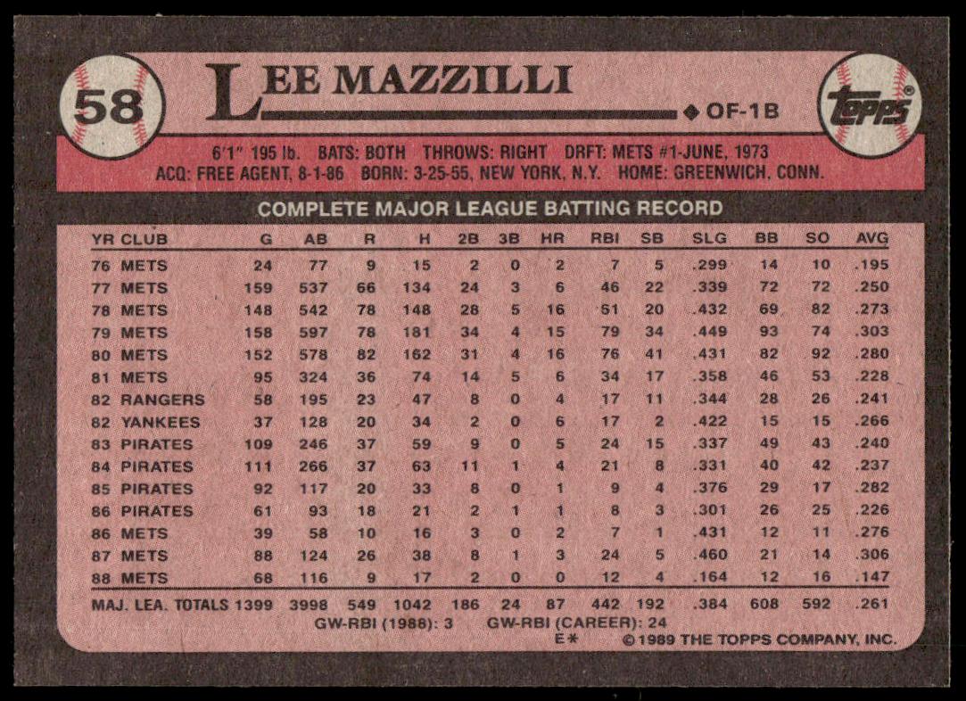 This Baseball card, from 1989 is part of the Topps  card set. Lee Mazzilli is featured and has a card number of 58.