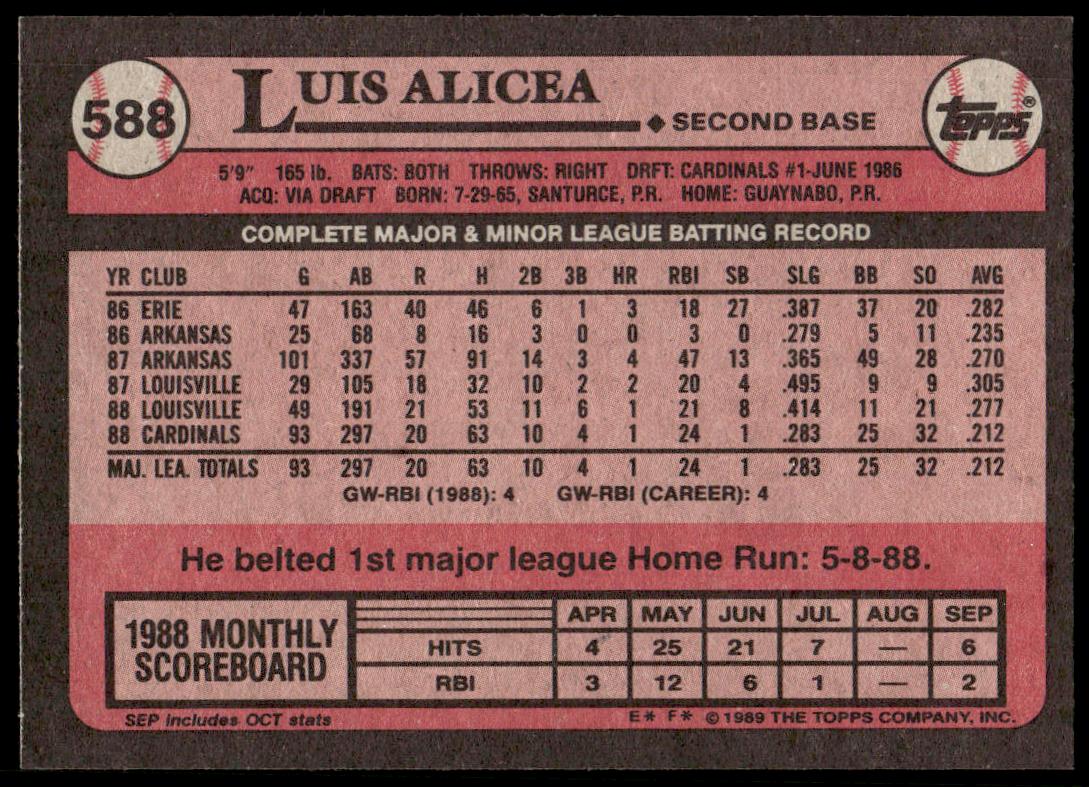 This Baseball card, from 1989 is part of the Topps  card set. Luis Alicea is featured and has a card number of 588.