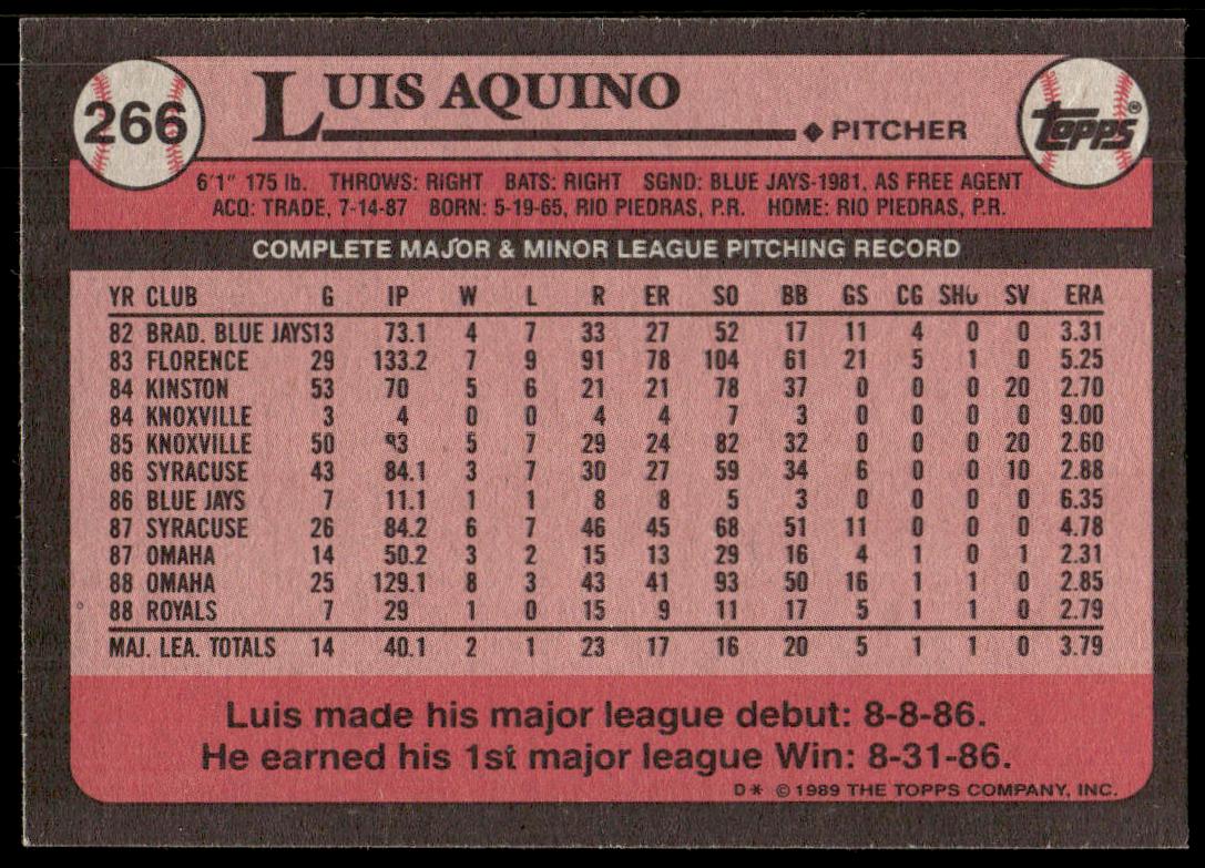 This Baseball card, from 1989 is part of the Topps  card set. Luis Aquino is featured and has a card number of 266.