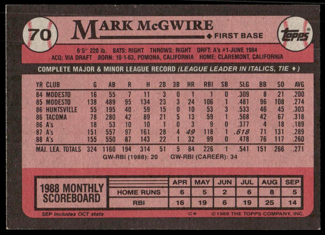 This Baseball card, from 1989 is part of the Topps  card set. Mark McGwire is featured and has a card number of 70.