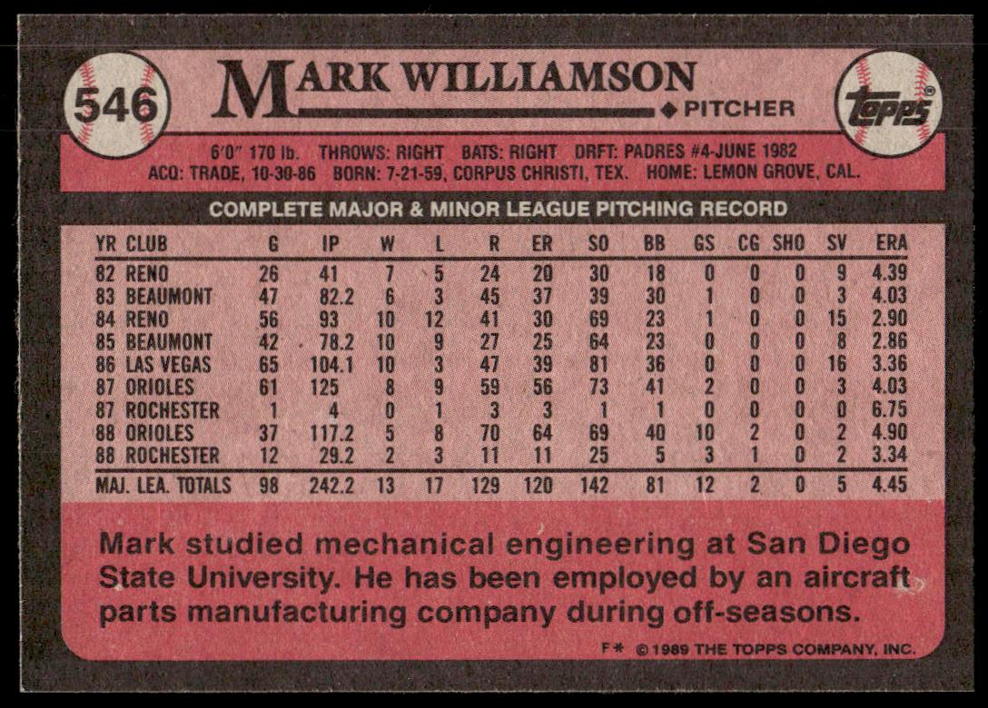 This Baseball card, from 1989 is part of the Topps  card set. Mark Williamson is featured and has a card number of 546.