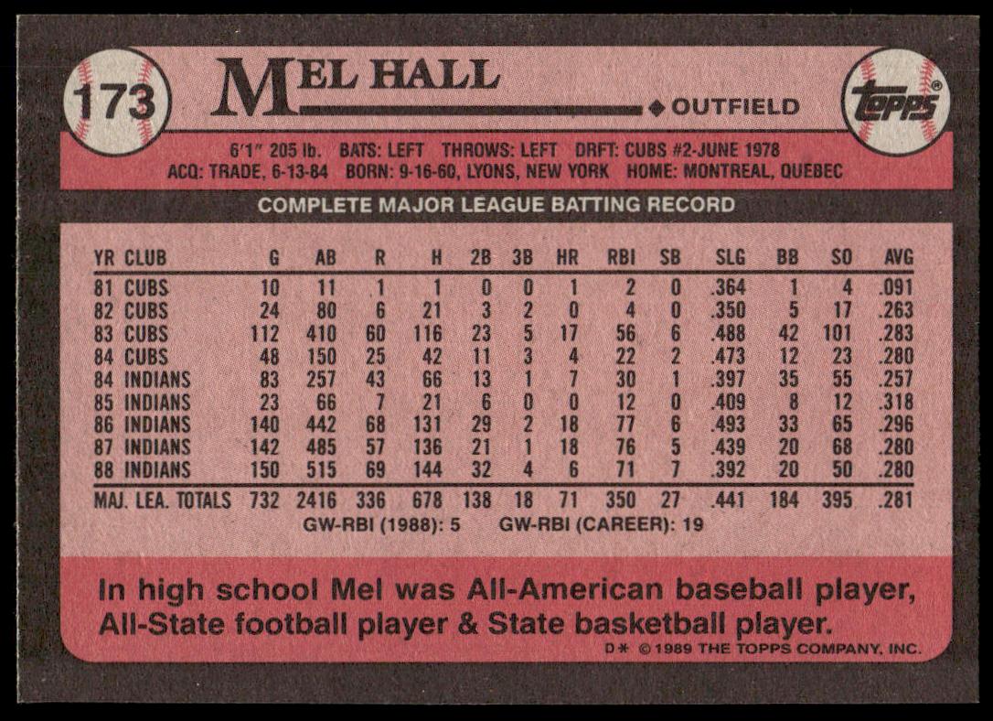 This Baseball card, from 1989 is part of the Topps  card set. Mel Hall is featured and has a card number of 173.