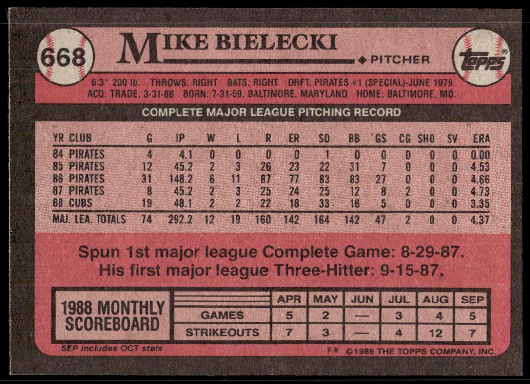 This Baseball card, from 1989 is part of the Topps  card set. Mike Bielecki is featured and has a card number of 668.