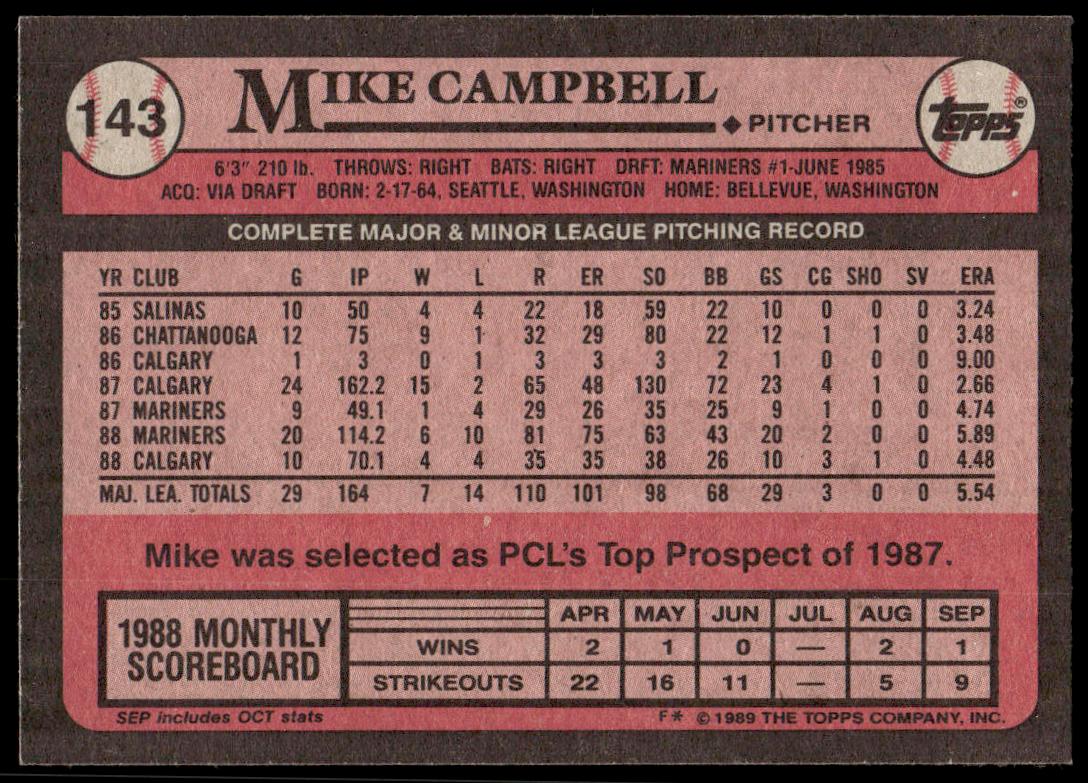 This Baseball card, from 1989 is part of the Topps  card set. Mike Campbell is featured and has a card number of 143.