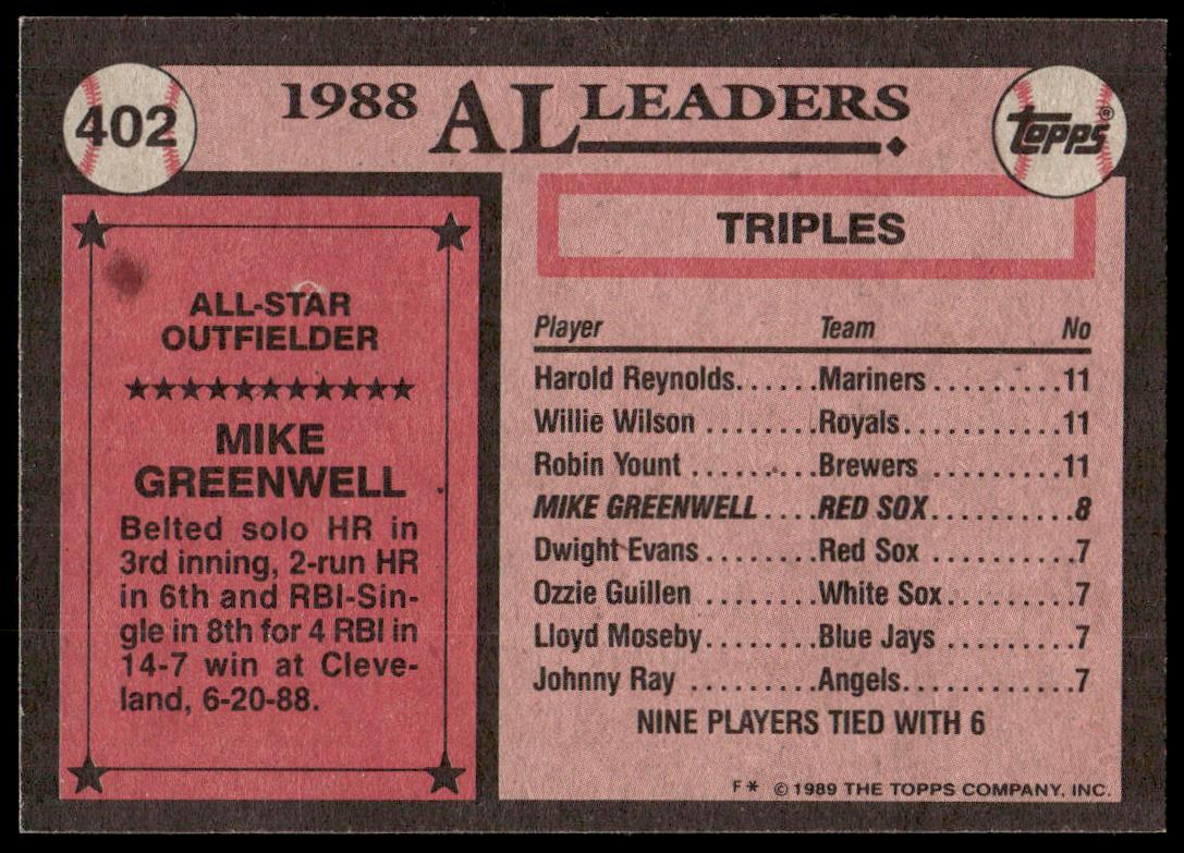 This Baseball card, from 1989 is part of the Topps  card set. Mike Greenwell is featured and has a card number of 402.