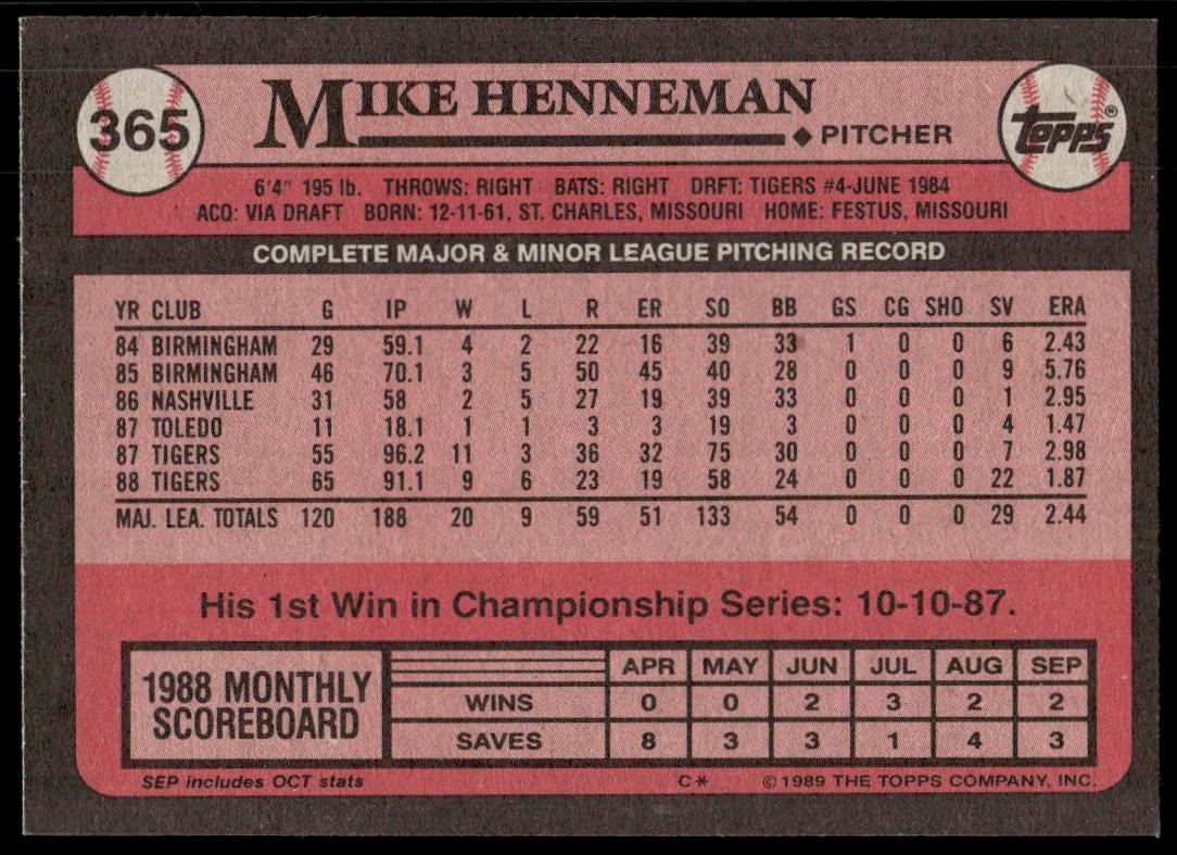 This Baseball card, from 1989 is part of the Topps  card set. Mike Henneman is featured and has a card number of 365.