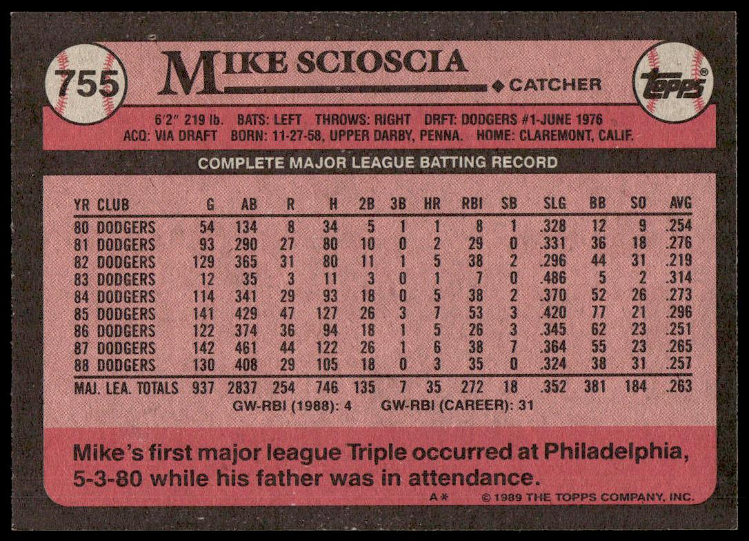 This Baseball card, from 1989 is part of the Topps  card set. Mike Scioscia is featured and has a card number of 755.