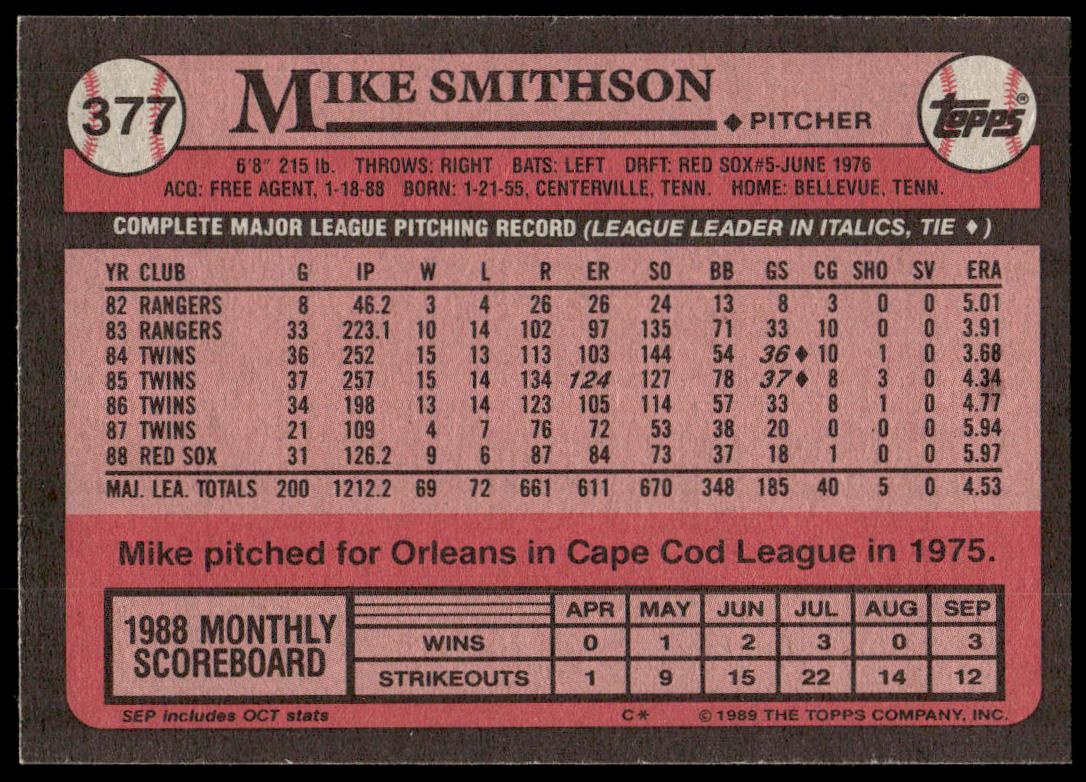 This Baseball card, from 1989 is part of the Topps  card set. Mike Smithson is featured and has a card number of 377.
