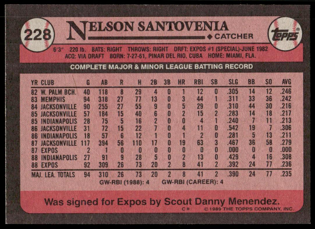 This Baseball card, from 1989 is part of the Topps  card set. Nelson Santovenia is featured and has a card number of 228.