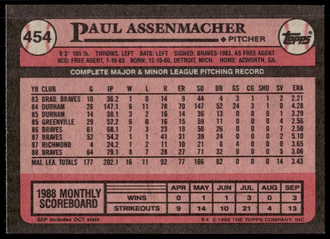 This Baseball card, from 1989 is part of the Topps  card set. Paul Assenmacher is featured and has a card number of 454.
