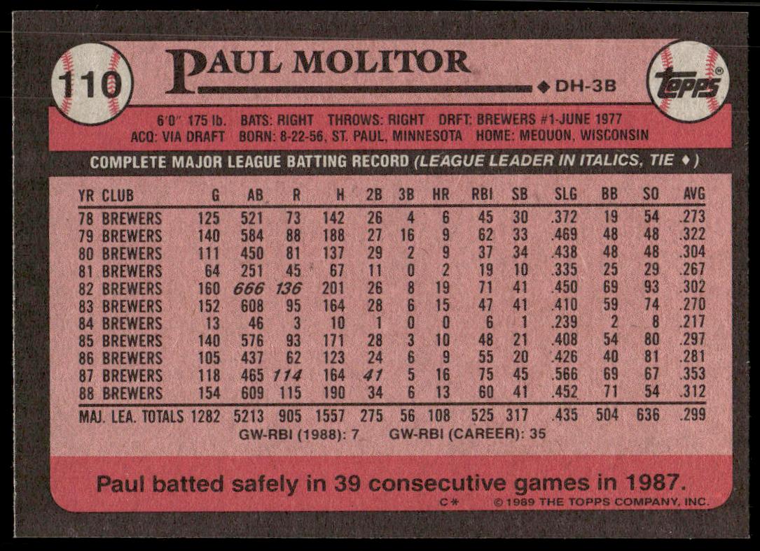 This Baseball card, from 1989 is part of the Topps  card set. Paul Molitor is featured and has a card number of 110.