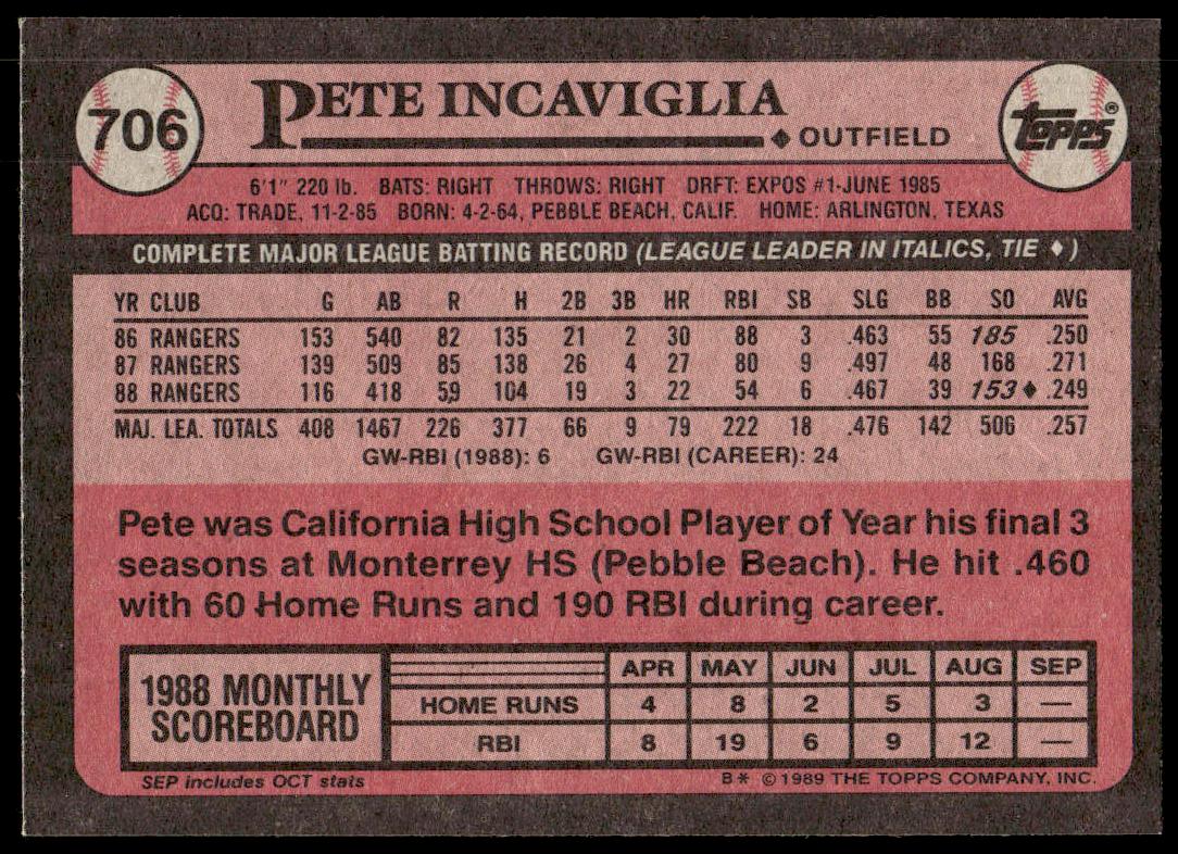 This Baseball card, from 1989 is part of the Topps  card set. Pete Incaviglia is featured and has a card number of 706.