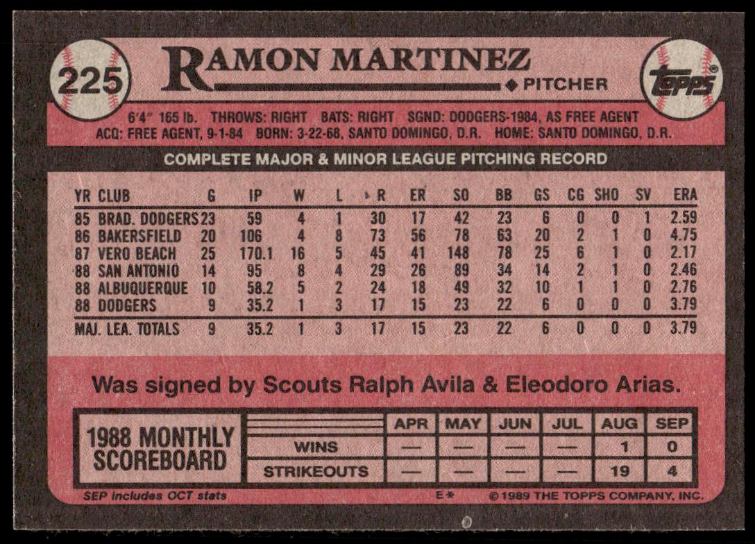 This Baseball card, from 1989 is part of the Topps  card set. Ramon Martinez is featured and has a card number of 225.
